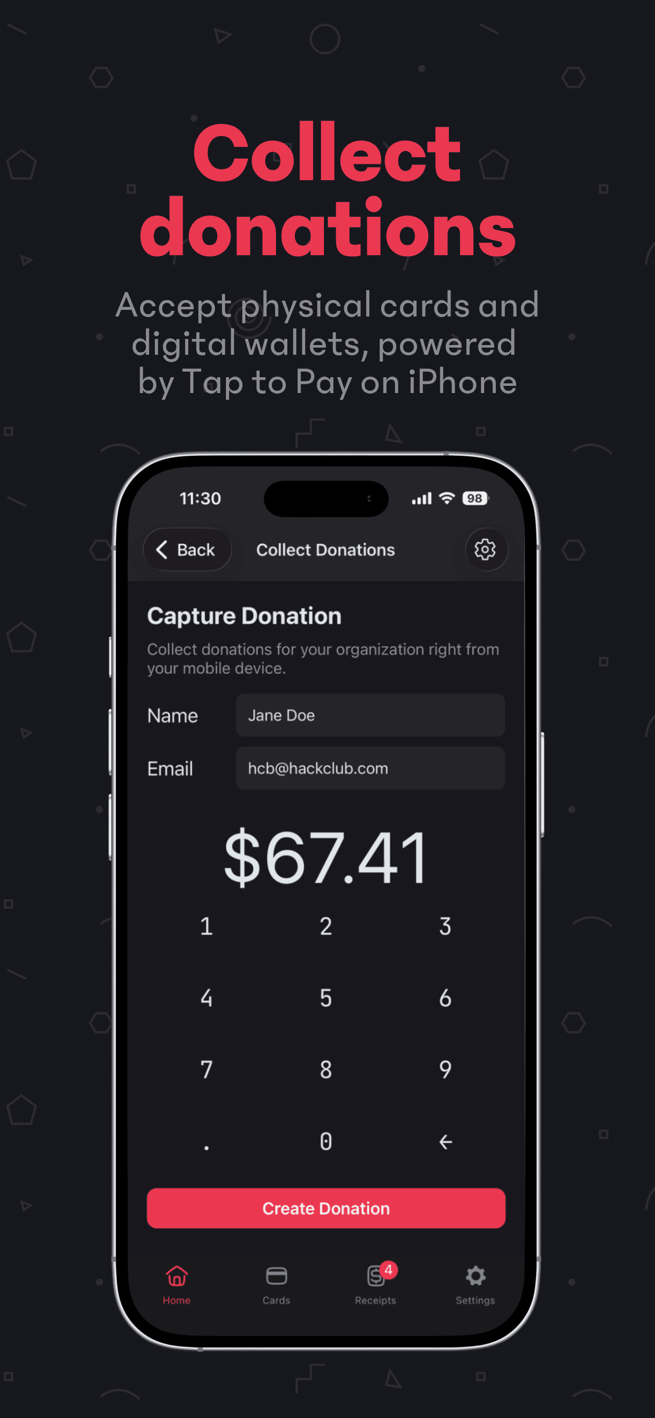 💰 Accept donations in-person: You can accept tap-to-pay donations directly on your device, perfect for an in-person fundraiser or event! No extra hardware required.