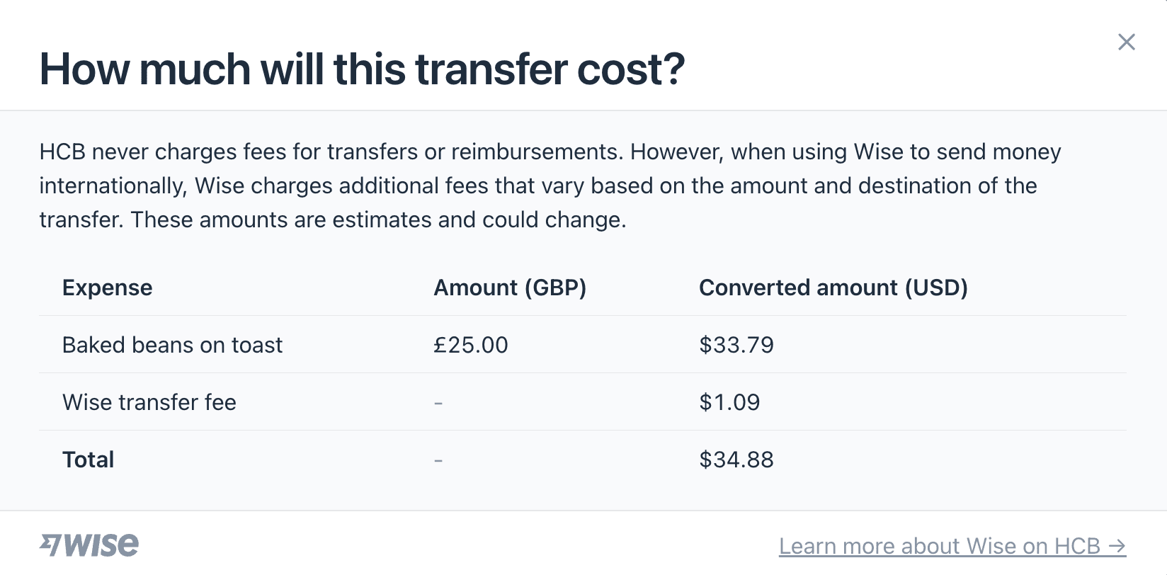 HCB never charges fees for transfers or reimbursements. However, Wise charges a fee for transfers processed through their network that varies based on the amount and destination of the transfer.